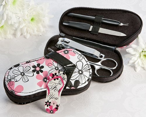 Wedding Favor - Bridal Shower Gift - Baby Shower Keepsake: Flirty Flip Flop Pedicure SetIt's a girl thing Who wouldn't love this fun-in-floral inspired flip flop pedicure set? This full featured 4 piece set comes complete with cuticle scissors, file, pedi-nail cutter, and cuticle tool, too. Best of all, the whimsical patent leather-look zippered carrying case keeps you organized and always ready for some pedi TLC. Spoil your girls with this keepsake gift that is as practical as it is fun. Of course, this thoughtful gal gift is ready-to-give and is completed with matching For You gift tag. Originally yours by Artisano Designs. Material: Synthetic carrying case and metal instruments; Flip Flop case measures 4.5 x 2.25 11.5 x 5.7 cm
